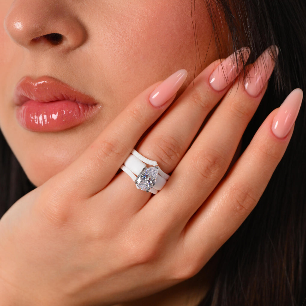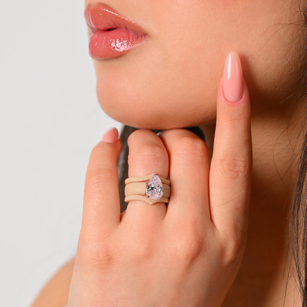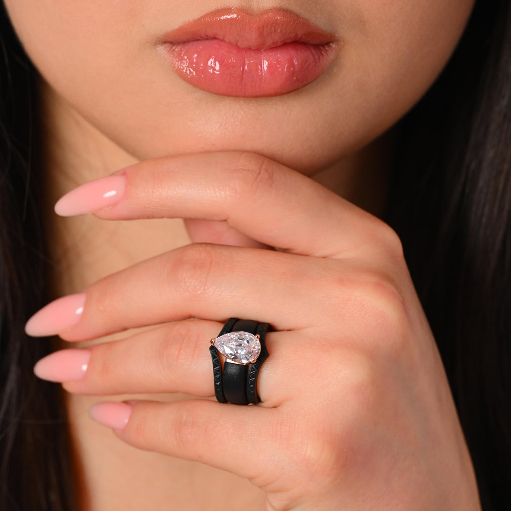 This stunning set features an 8×12 mm pear-cut cubic zirconia, beautifully set in a soft silicone band. The perfect balance of sparkle, comfort, and modern durability.