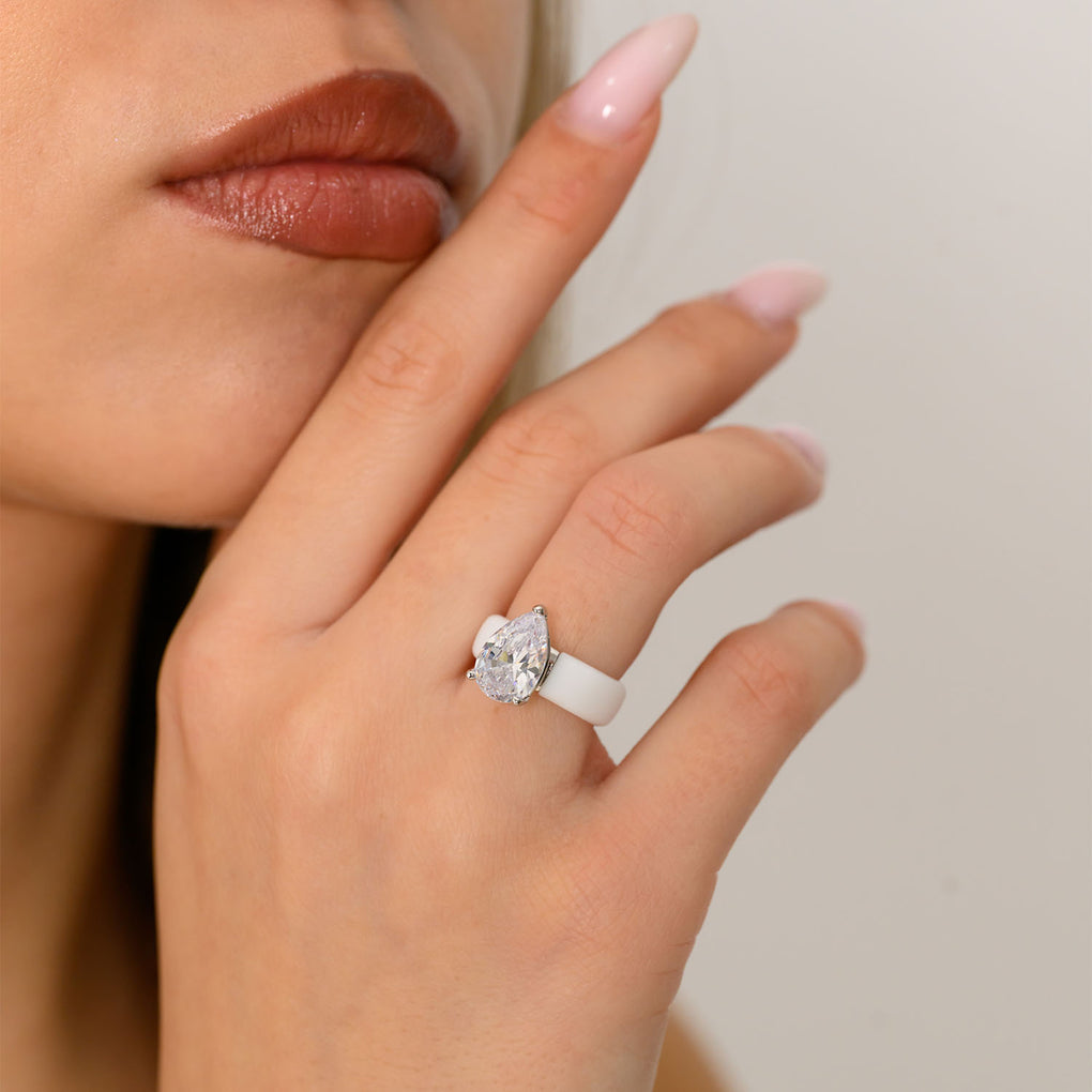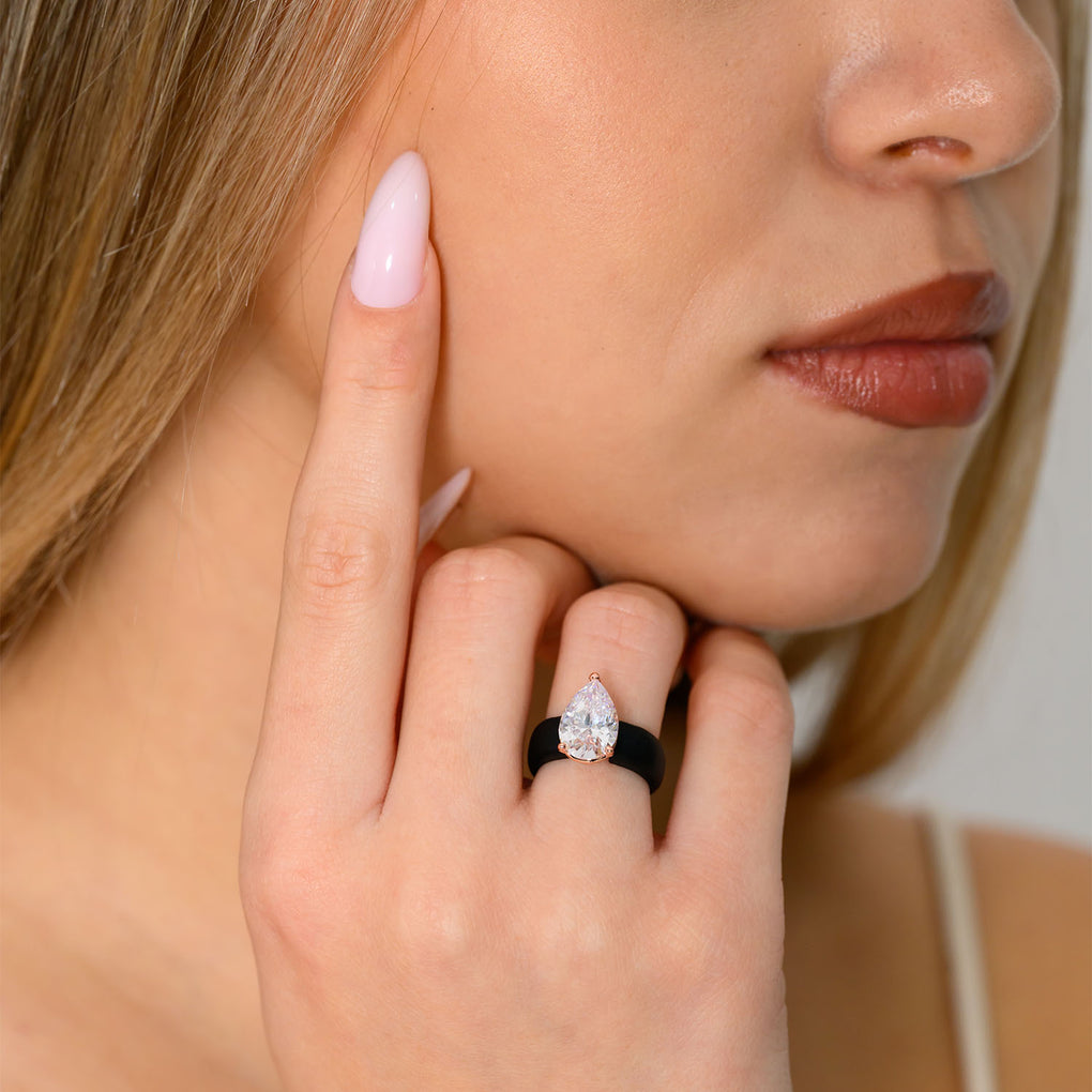This stunning ring features an 8×12 mm pear-cut cubic zirconia, beautifully set in a soft silicone band. The perfect balance of sparkle, comfort, and modern durability.