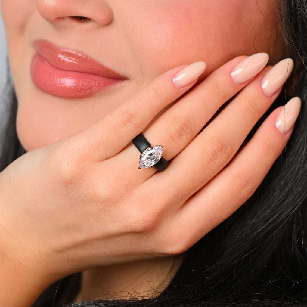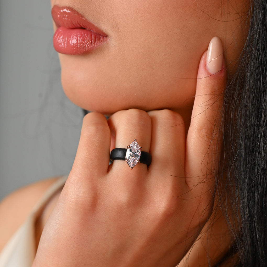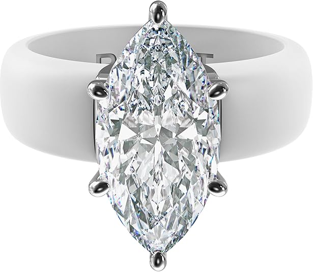 This stunning ring features a 14×7 mm Marquise-cut cubic zirconia, beautifully set in a soft silicone band. The perfect balance of sparkle, comfort, and modern durability.