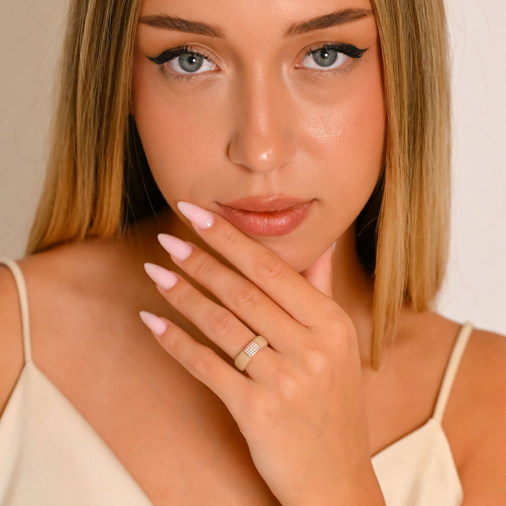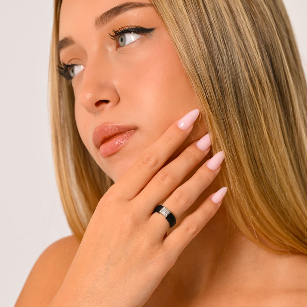 This ring features a beautifully bold 7mm round-cut cubic zirconia stone set in a soft, flexible silicone band. Designed for those who live, love, and shine in motion.