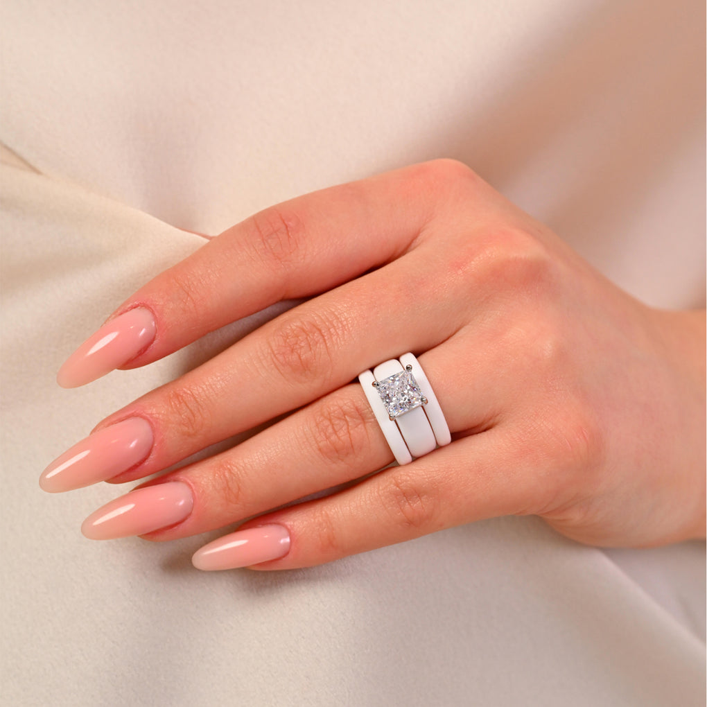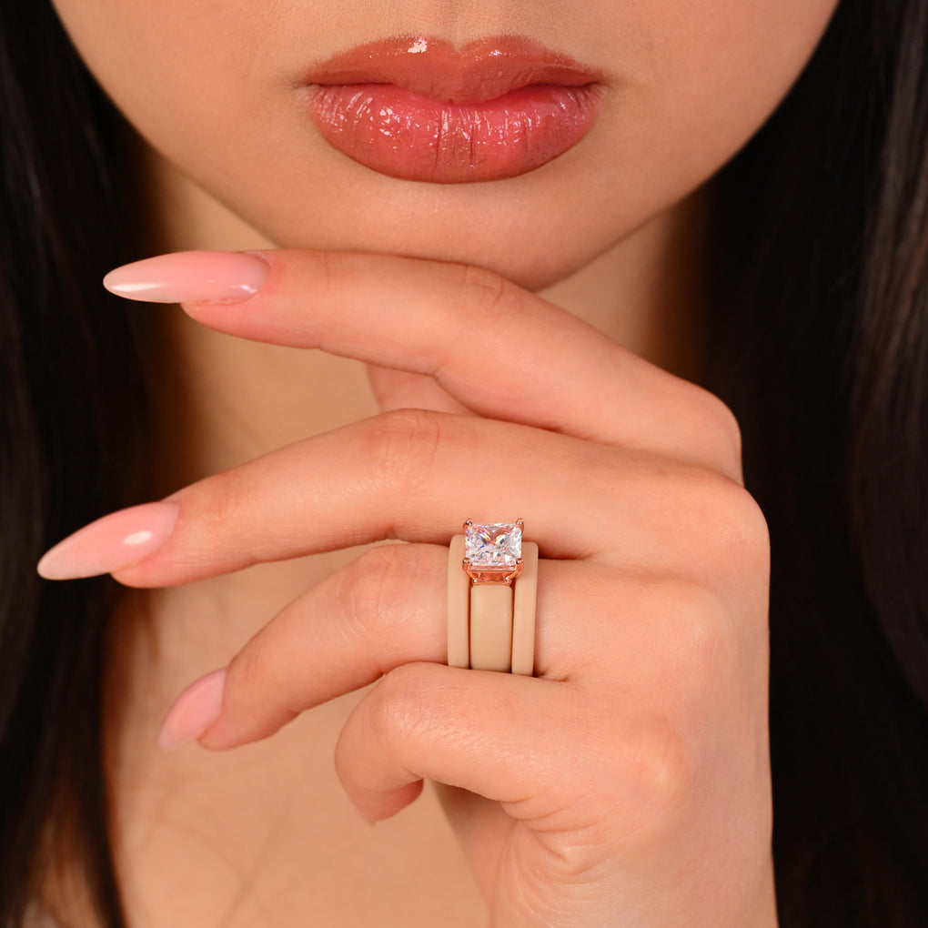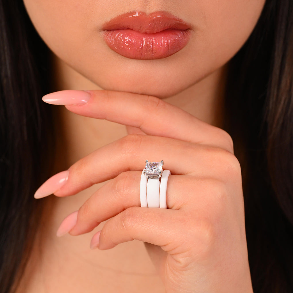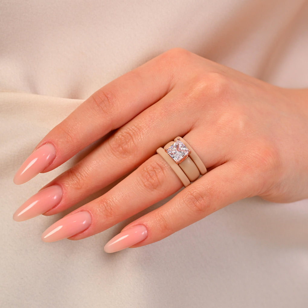 The GlowStone Princess Set features a stunning 8 x 8 mm Princess-cut cubic zirconia paired with two thin silicone rings in a stylish stackable design. Created for women who want sparkle without sacrificing comfort, this set blends modern durability with a refined, elevated look.